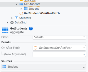 Step10: Aggregate GetStudents have list of events in properties section. Select “On After Each” Event from list. It show one pop up box then click New Client Action tab. Now it create one client action for student_Grid Screen.