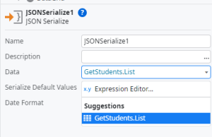Step11:Now double click on the client action. Drag and Drop JSON Serialize object from left side property tools. Set data property for JSON Object is GetStudents.List