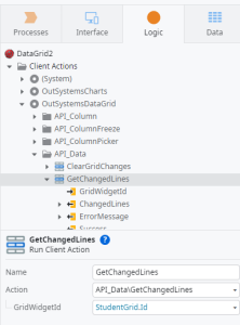 Step13: Add new client action “SaveOnClick” and double click on client action to enter into it. Drag and Drop “Get Change Lines” Tool from API_Data and set property Grid Widget id = StudentGrid.Id