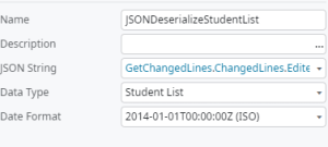 Step14:Drag and Drop JSON Deserialize object and set property DATA TYPE = “Student.List” and JSON STRING = “GetChangedLines.ChangedLines.EditedLines”.