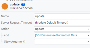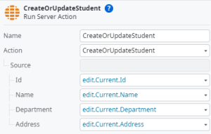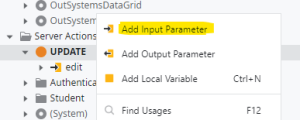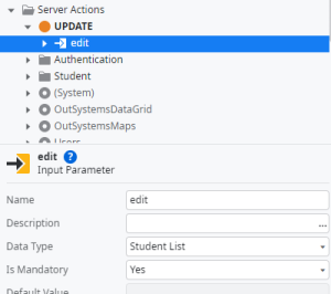 Step16:Give Name of the server action “Update”. To add input parameter edit (Right click of update action) for server action and map data type as Student List
