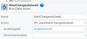 Step18: Add “Mark Changes as Saved“ From API Data into client action (Save on click) after server action and set Grid widget id = StudentGrid.ID . Finally add success message for acknowledgment.