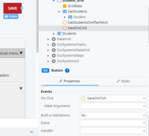 Step20:Now add one new button on Student_Grid Form then change button name as Save and button action mapping event for saveonclick client action.