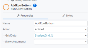 Step21:Now add another one button on Student_Grid From and change it name as Add row. Double click on add row button it automatically creates a new Event named as “Add Row On Click” Event. Inside of the Event we need to create one client action “Add Bottom Row” action and set action property Grid Data = Student Grid.ID