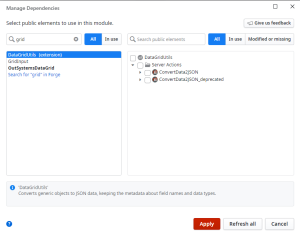 Step-4: After installation complete it will appear on your service studio. Click Manage Dependencies (Ctrl+Q) to select grid then click apply button.