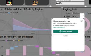 I generated a recap of the report’s visuals using Smart Narrative. There are two choices available: Copilot and Custom.