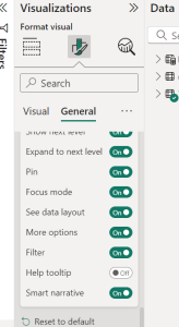 An optional icon can be included in the header of a visual to activate an on-demand summary of its contents. Include it to ensure that results can be transmitted to all assistive technology devices for accessibility purposes. You have the option to activate it in the Format section of specific visuals or include it in your personalized theme file for the selected visual types. Choose a visual and then go to the Format pane to select General. Extend the Header icons section, then extend the Icons section, and enable Smart narrative.
