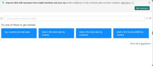 If you are not sure which question to pose or which text to utilize, click on the Show all suggestions link on the report canvas to view all suggestions provided by Power BI. Another method involves examining the data fields within the Data pane. You can find inspiration for topic-related inquiries and distinctive vocabulary for the semantic framework to incorporate into your search.