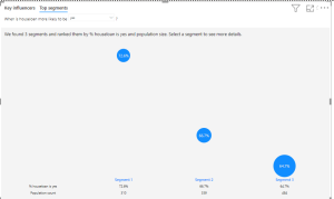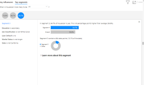 There are two tabs Key Influence & Top Segments. Key influencers show you the top contributors to the selected metric value. Top segments show you the top segments that contribute to the selected metric value. A segment is made up of a combination of values.