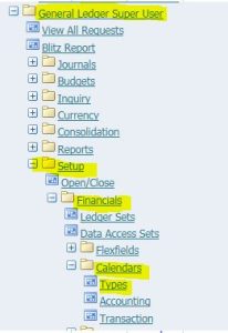 Path: General ledger super user > Setup > Financials > Calendars > Types