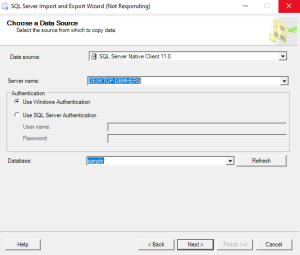 Select database source as sql native client, select the server name and provide the database name in which the tables are present  in which we are going to export