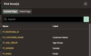 • Selection Type: Choose “Item” and then select the input field (e.g., P1_CUSTOMER_NAME) from the list of items.