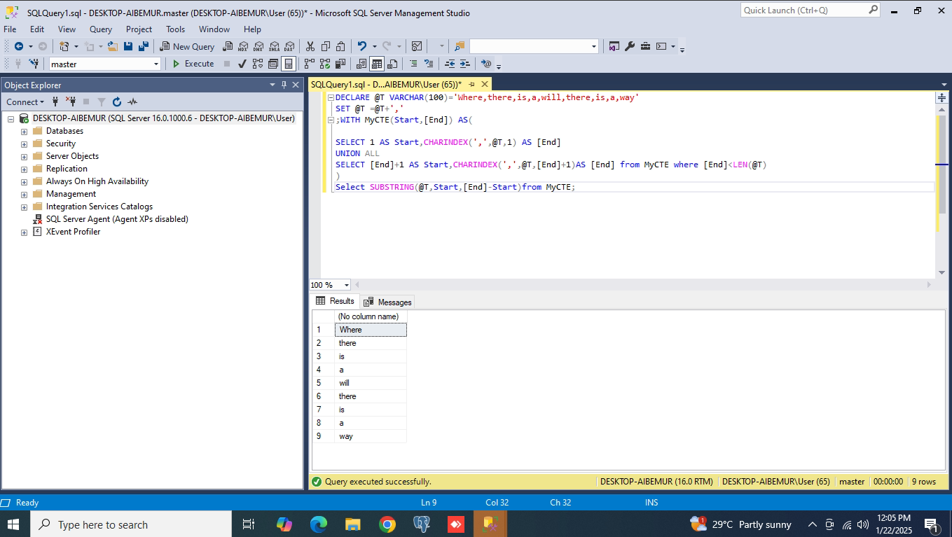 DECLARE @T VARCHAR(100) = ‘Where,there,is,a,will,there,is,a,way’;— Append a comma at the end to simplify parsingSET @T = @T + ‘,’;;WITH MyCTE(Start, [End]) AS (— Anchor Member: Find the position of the first commaSELECT1 AS Start,CHARINDEX(‘,’, @T, 1) AS [End]UNION ALL— Recursive Member: Continue finding commas after the previous oneSELECT[End] + 1 AS Start,CHARINDEX(‘,’, @T, [End] + 1) AS [End]FROM MyCTEWHERE [End] < LEN(@T) — Stop when the last comma is reached)— Extract substrings based on the calculated Start and End positionsSELECTSUBSTRING(@T, Start, [End] – Start) AS ValueFROM MyCTEWHERE [End] > 0; — Ensure valid positions