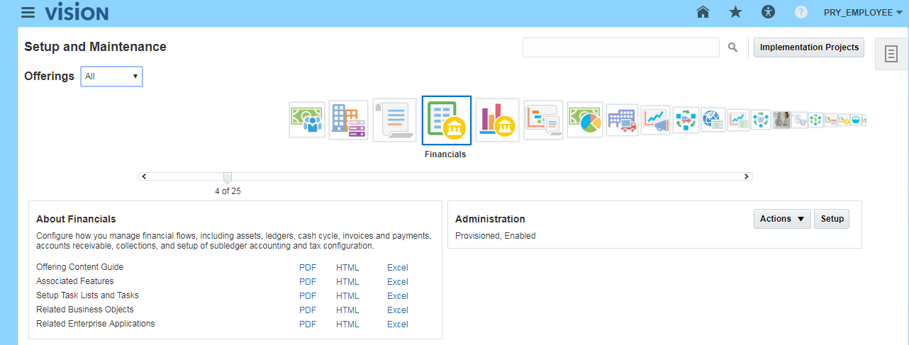 Step 4: below is the functional setup manager window; we could able to see all the offerings as provisioned and enabled