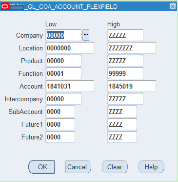 Enter the low end and the high end of your segment combination range. Neither the low nor the high combination has to be a valid key flexfield combination, nor do they need to be made up of valid segment values.