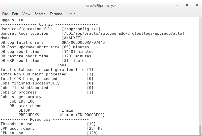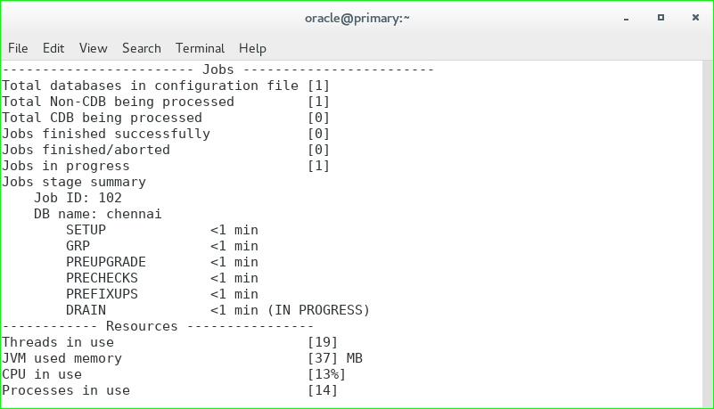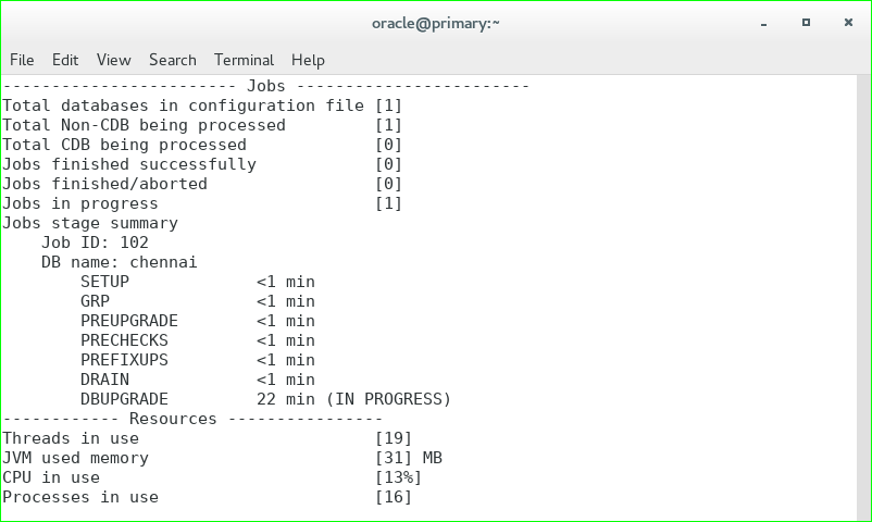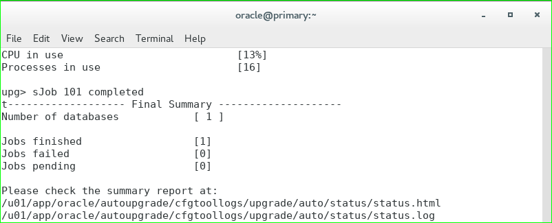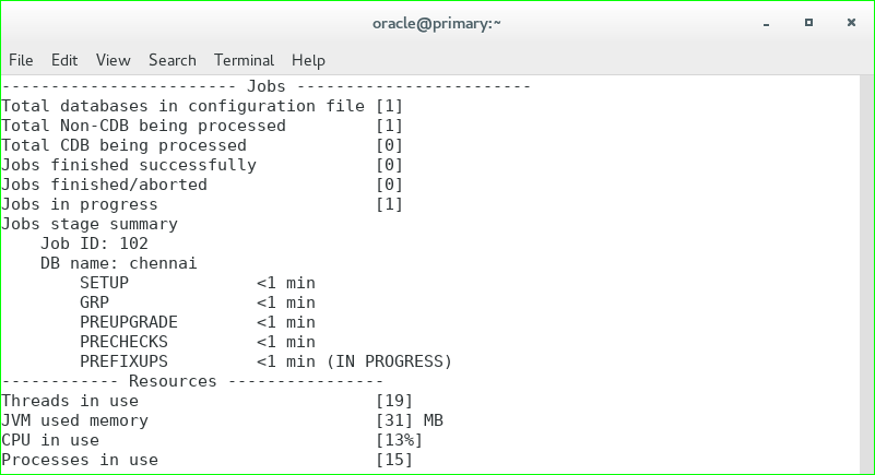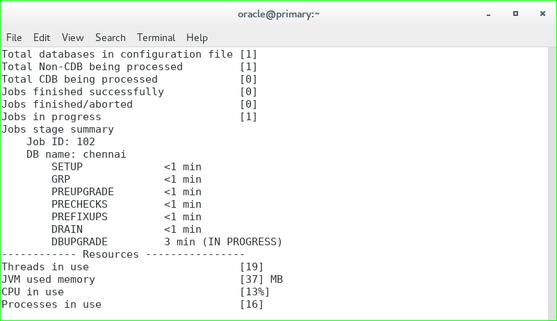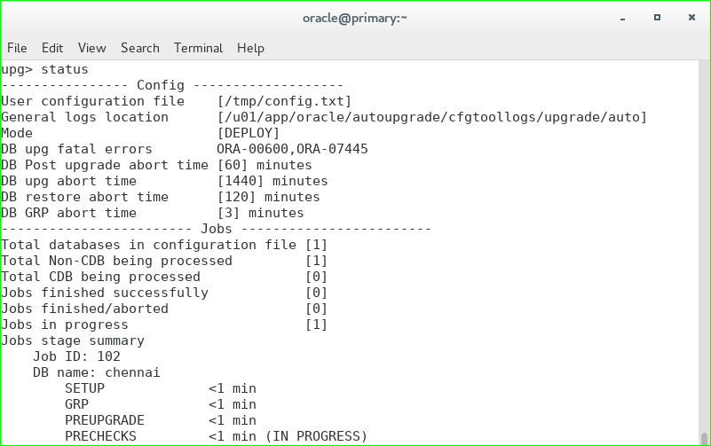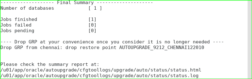 status – it gives an overall summary of the upgrade, here we can see the no of container and non-container databases, job finished successfully, job aborted and jobs which are in progress state.