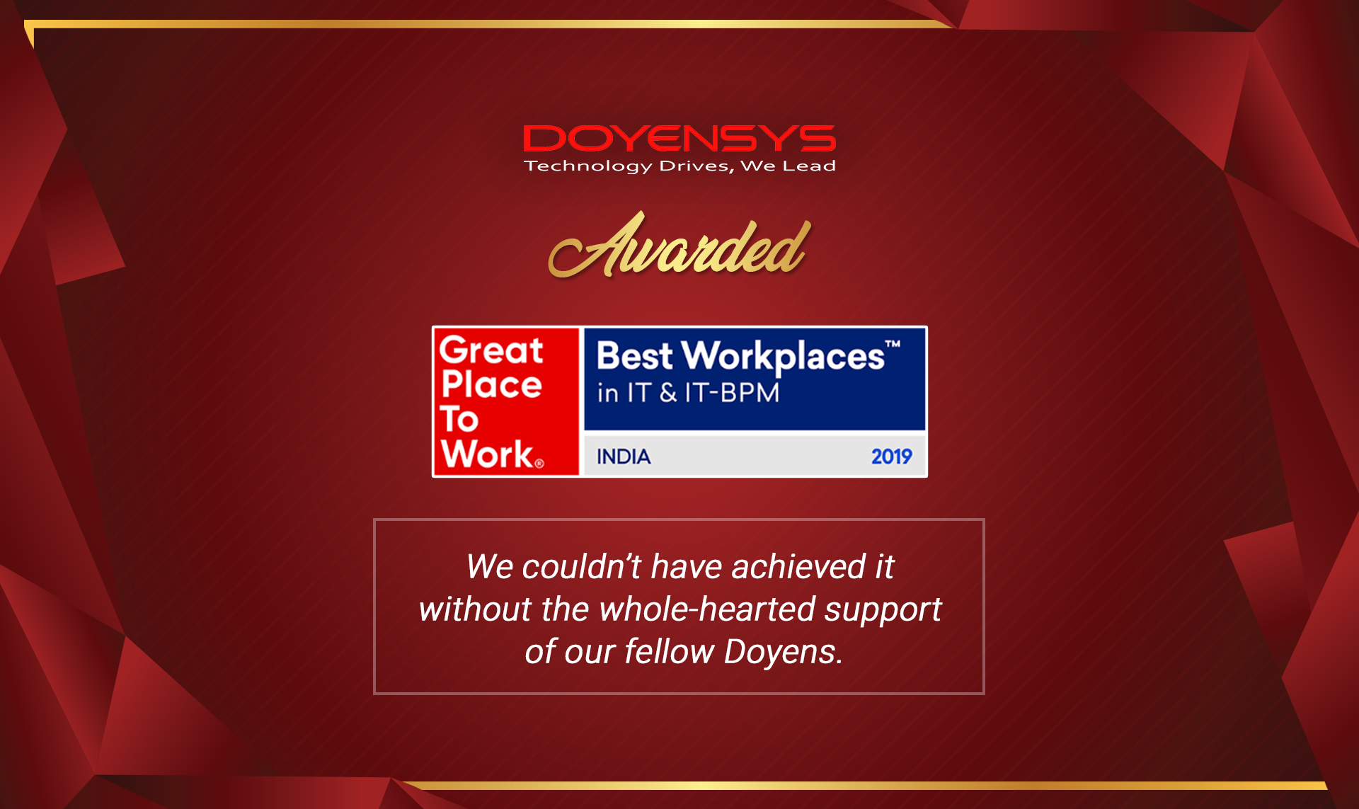 Doyensys is successful in creating an excellent workplace for all our employees. Due to the continuous efforts of our team, our work is being recognized all across the globe. It is evident from our recent achievement that Great Place to Work has honoured us by including in their list of Great Mid-Size Workplaces of India 2019.