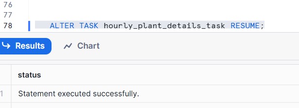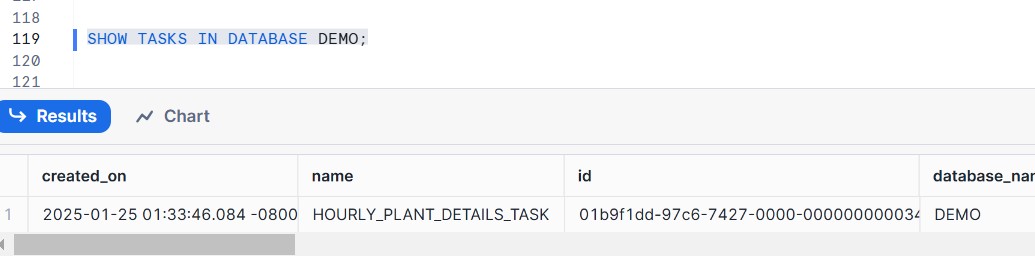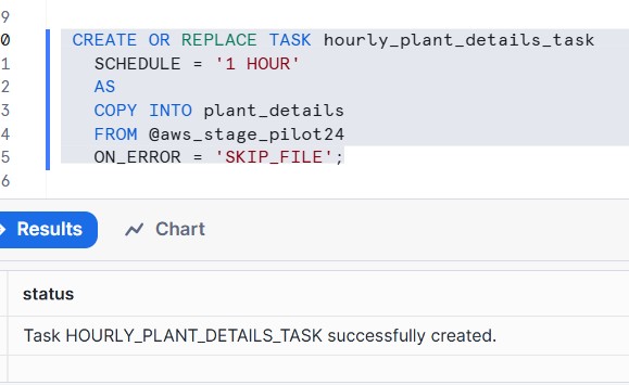CREATE OR REPLACE TASK hourly_plant_details_task SCHEDULE = ‘1 HOUR’ AS COPY INTO plant_details FROM @aws_stage_pilot24 ON_ERROR = ‘SKIP_FILE’;
