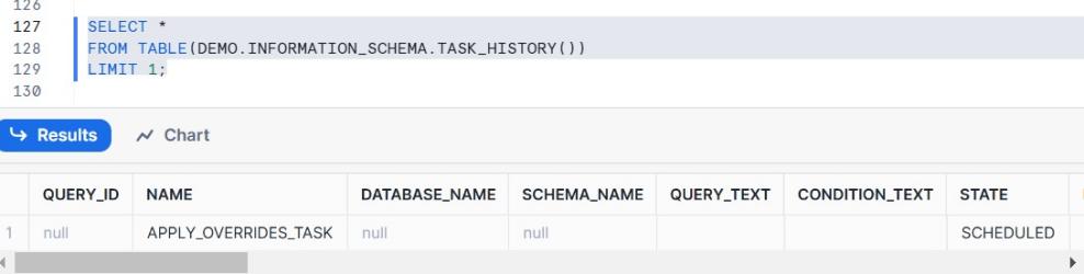SELECT * FROM TABLE (DEMO.INFORMATION_SCHEMA.TASK_HISTORY()) LIMIT 1;