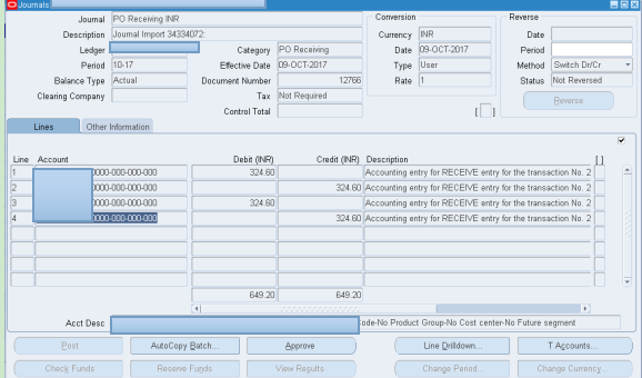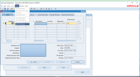 Navigation: Oracle Inventory > Transactions > Receiving > Receipts