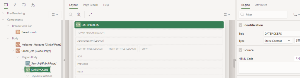 Step 1:  Create a new page with the static region and set static ID as “datePickers”.