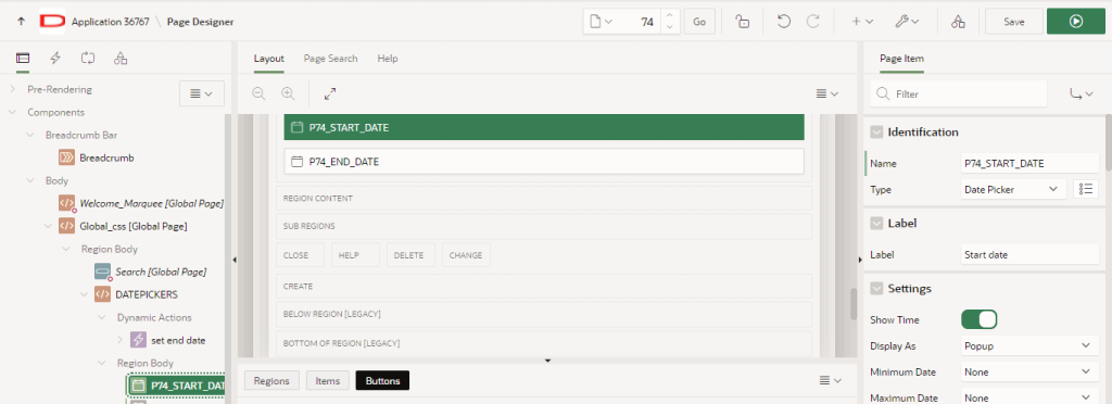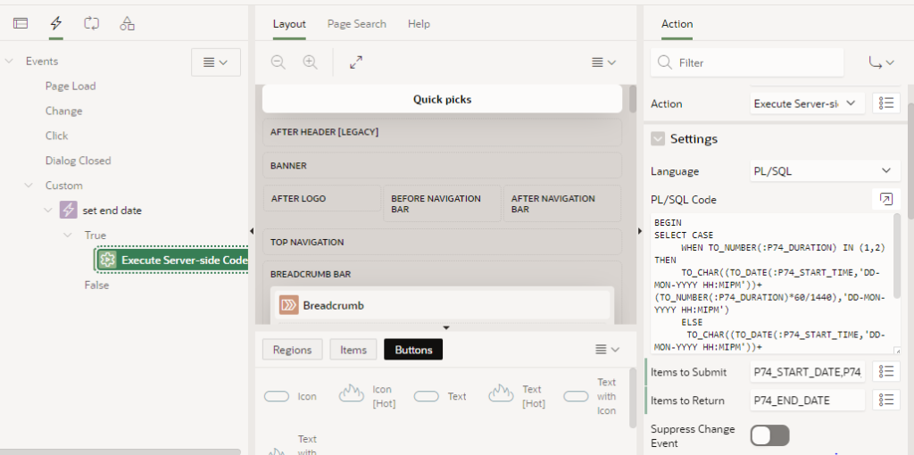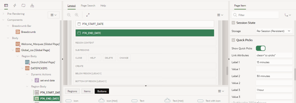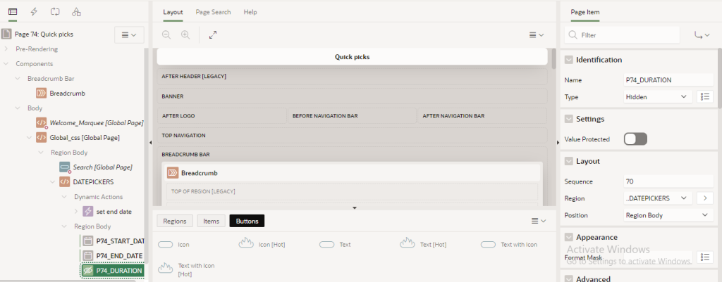 Step 2:  Create page items (P74_START_DATE, P74_END_DATE,P74_DURATION-HIDDEN) with quick link labels and attributes.