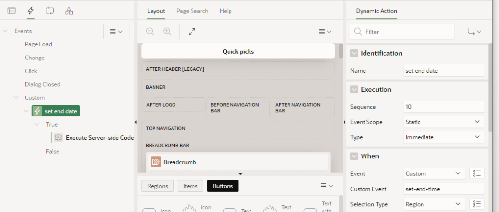 Step 4: Create dynamic action on custom event and map it to Quick pick links with server side PLSQL code.