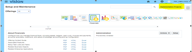 Step5: we could see Financials Offering as provisioned and enabled, we need to click on Implementation projects button in the below screenshot.