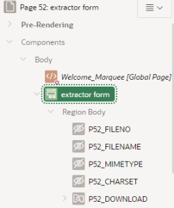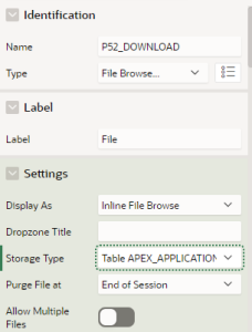 Step 1: Create a new page with four page items (file browser,file type,Mime type,Charset) and change the storage type of file browser as “Table APEX_APPLICATION_TEMP_FILES”
