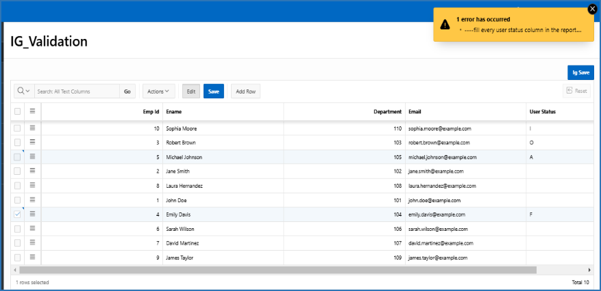 In Oracle APEX, ensuring all rows in an Interactive Grid are filled is crucial for maintaining data integrity and preventing incomplete submissions.Row-level validation can be implemented to check if all required fields in each row are filled before saving or submitting data.This validation ensures the application behaves predictably and meets business requirements. By leveraging Oracle APEX’s dynamic actions and validations, developers can enforce this rule seamlessly.