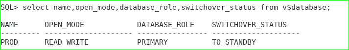 NAME         OPEN_MODE          DATABASE_ROLE   SWITCHOVER_STATUS