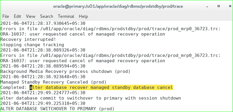 Step:7 Then convert the physical standby into primary db.(stop the MRP process)