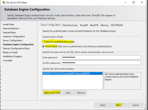 STEP 10: We can select both Windows authentication mode and Mixed mode. Select “Add current user” and click next.