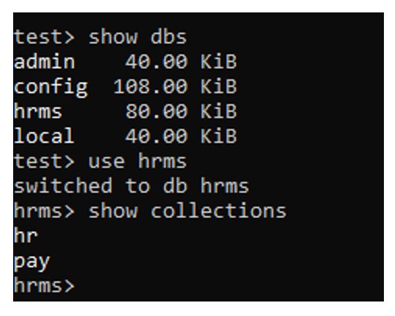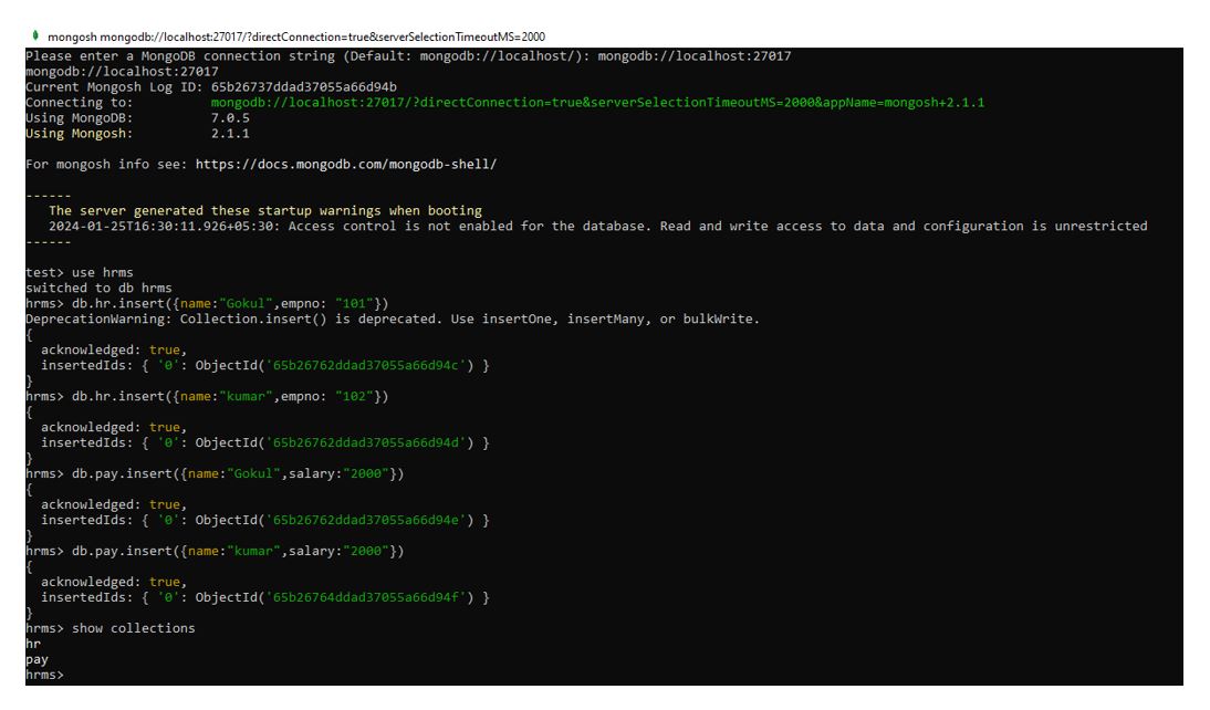Step 1: To begin, we must establish a connection with the mongo shell command “mongosh” and proceed to create the sample database along with a few collections (table).