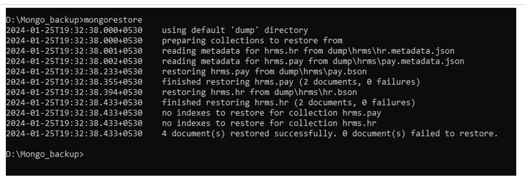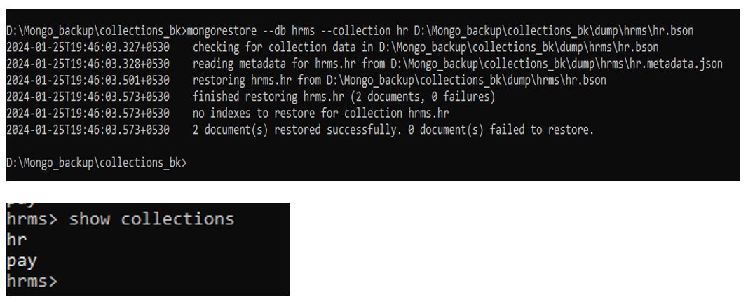Mongorestore –db hrms –collection hr D:\Mongo_backup\collections_bk\dump\hrms\hr.bson