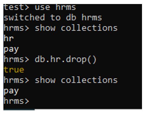 Step 7: Drop the single collections (table) using the command “db.hr.drop()”