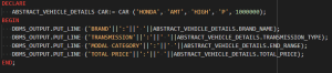 DBMS_OUTPUT.PUT_LINE(‘TRANSMISSION’||’:’||”||ABSTRACT_VEHICLE_DETAILS.TRANSMISSION_TYPE);