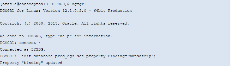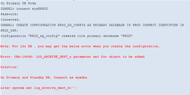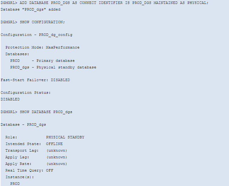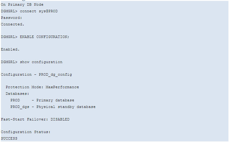 - In the DGMGRL console, input “show configuration”, make sure there is no error reported and configuration status should be SUCCESS.
