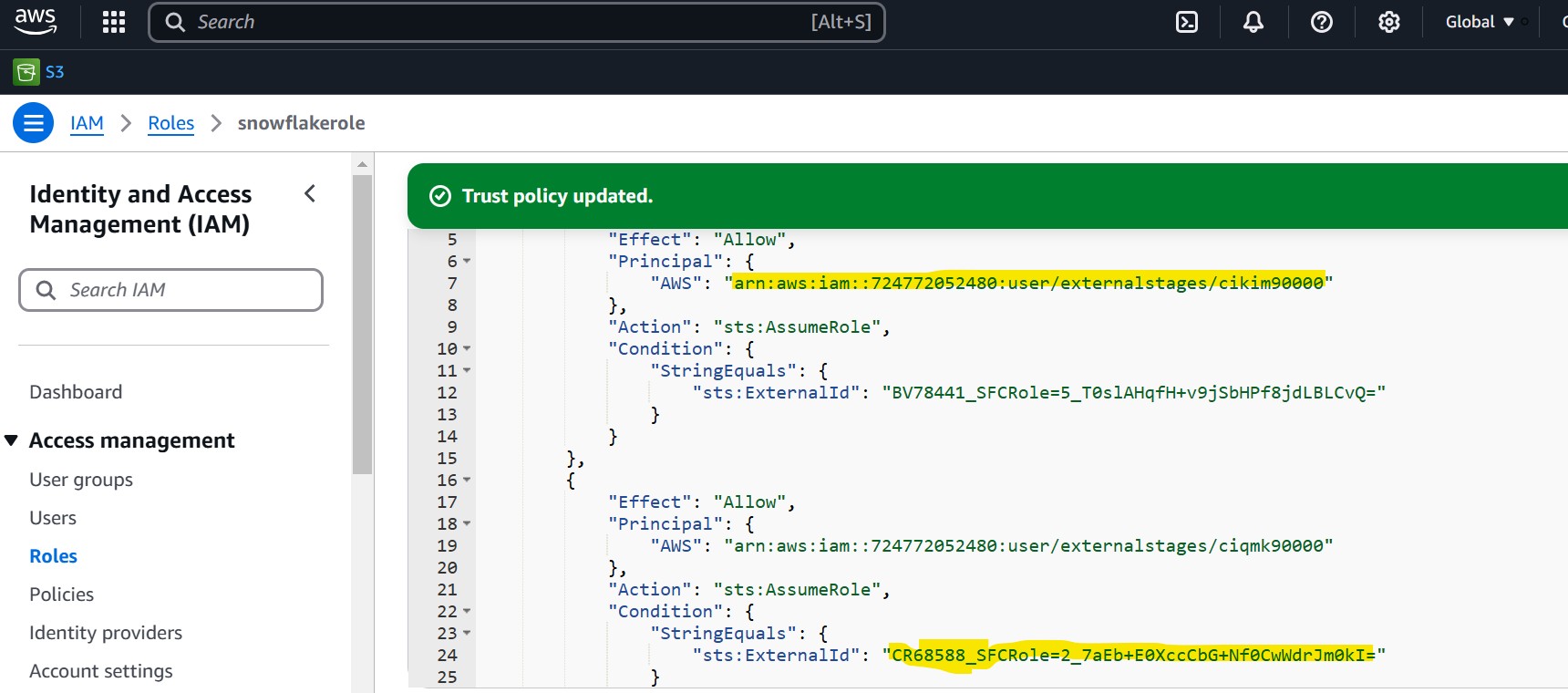 Add Snowflake as a trusted entity by attaching the following trust policy in AWS role as follows