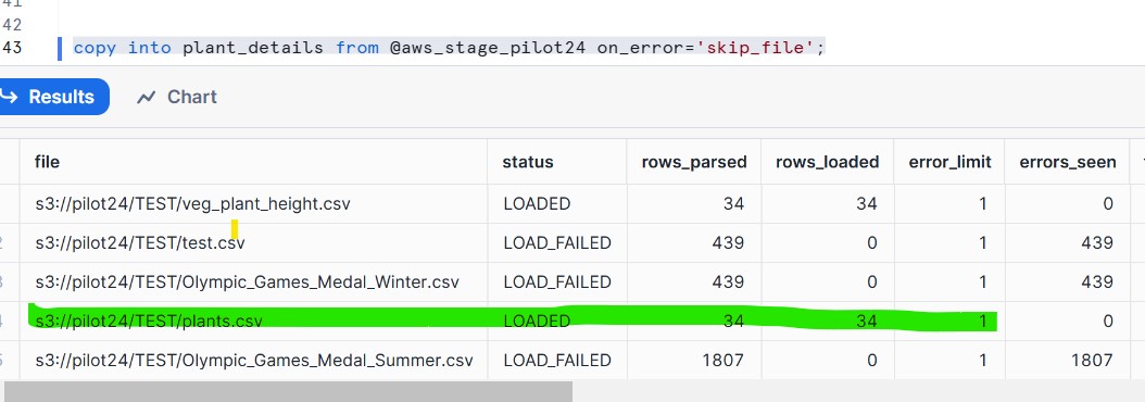 copy into plant_details from @aws_stage_pilot24 on_error=’skip_file’;