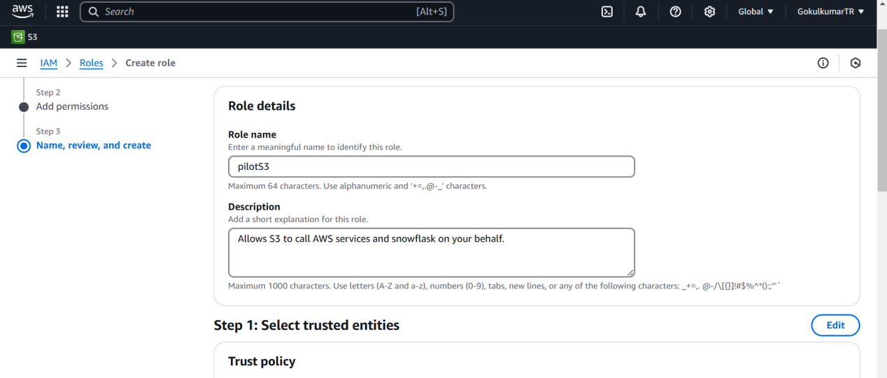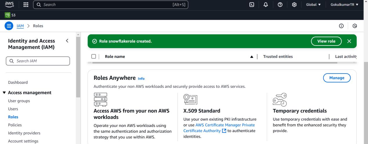 AWS IAM Role->Create an IAM role for Snowflake to access your S3 bucket.