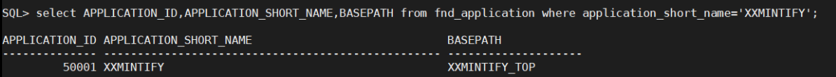 13. Log in to SQL*Plus as APPS, and run the following SQL to confirm that the fnd_application table has one row