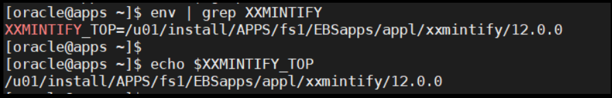16. To ensure the new environment file is picked up, log out and back in again as applmgr or oracle then run the following command to confirm the $XXMINTIFY_TOP variable is correctly set