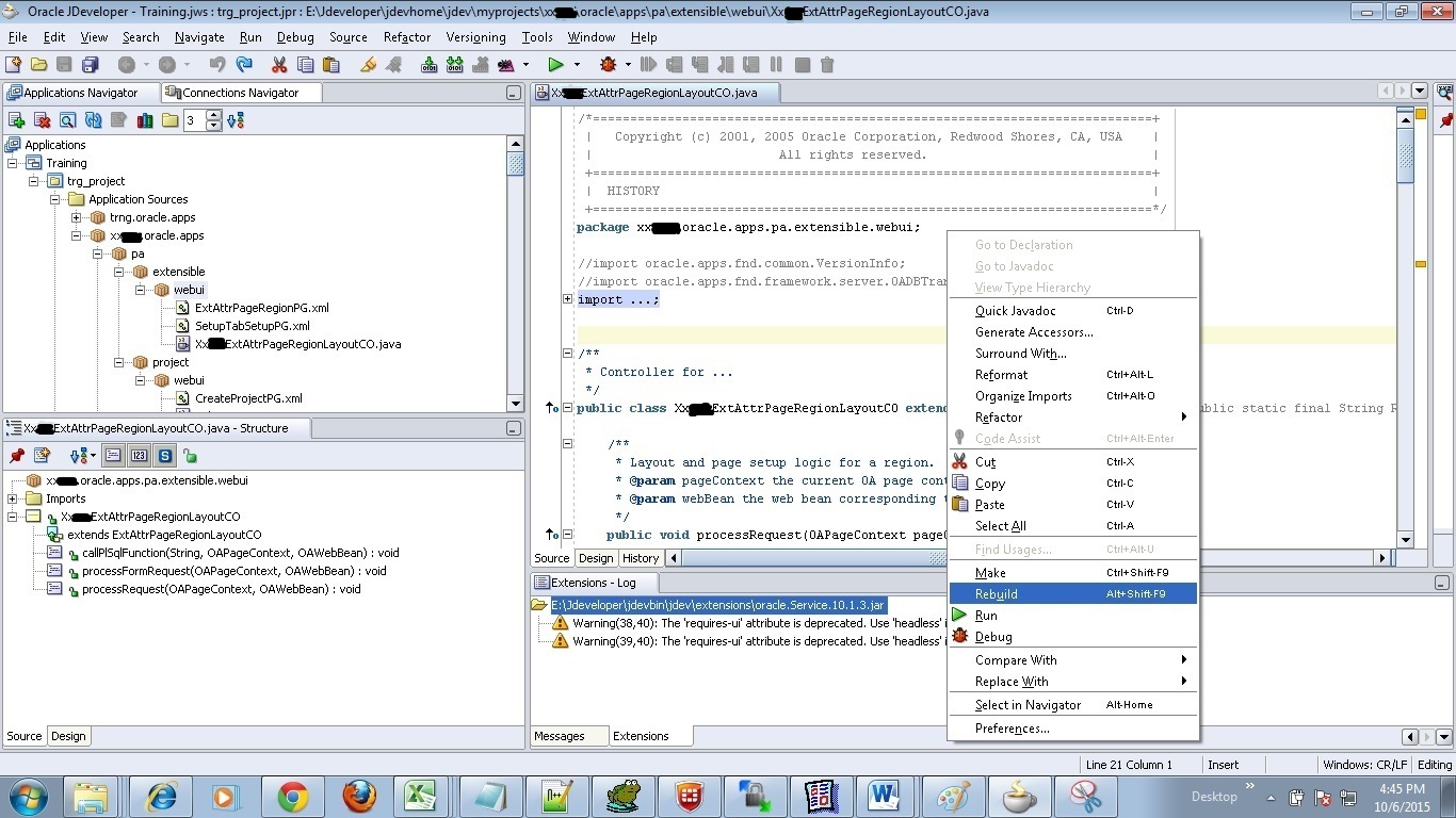 Open the controller code in JDeveloper by double click on XXExtAttrPageRegionLayoutCO.java under its directory path. Once the controller code opens, it will say its directory path of which this file is being located, which seeded controller it should be extended from; we can import some of the predefined class files in this class to get access to methods.
