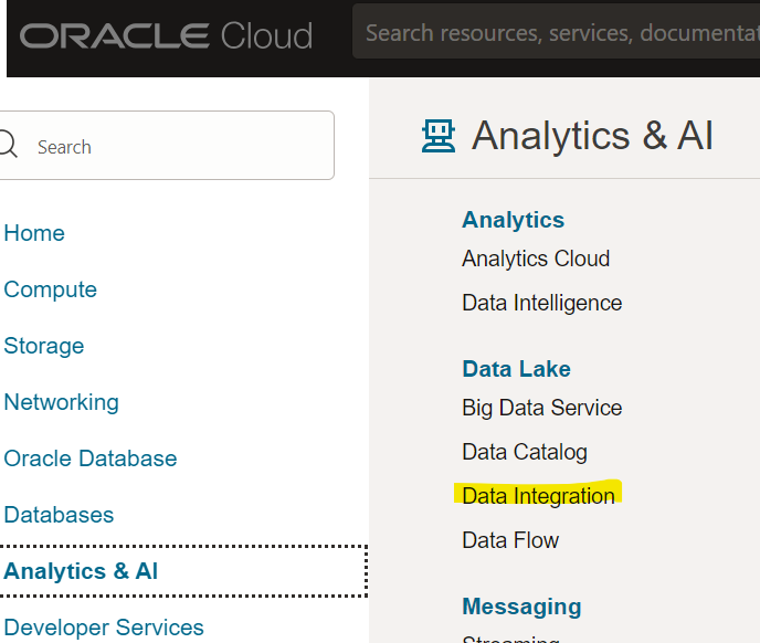 In the OCI Console, use the left-hand menu to go to Data Integration under the Data & AI category.