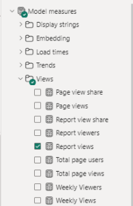 Under Model measures, expand Views, and add Report views to the Filters pane.