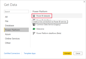 • In the left pane, select Power Platform, then select Power BI semantic modelsConnect.