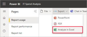 2. Open the usage metrics report, select ExportAnalyze in Excel.