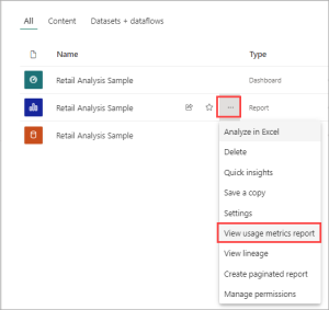 2. From the workspace content list, select More options (…)for the report and select View usage metrics report.